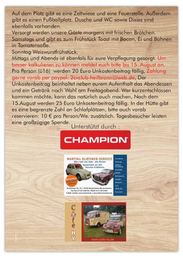 auf dem Scoutcamping "Toutschemillen" in Wiltz. Anmeldung erforderlich. Kosten 80 Euro, davon 40 Euro bei Anmeldung zahlbar. Info: http://www.2cvclub.lu, email: contact@2cvclub.lu
